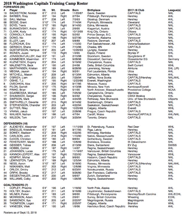 - Gionta and the Kings’ junior tryouts are far from the only camp invitees across the league. As teams have announced their camp rosters, many previously unannounced PTO’s have been revealed. The defending champion Washington Capitals have invited Canadian collegiate forward Mark Simpson and WHL goalie Logan Thompson to camp. Their Stanley Cup competitors, the Vegas Golden Knights, will have junior forwards Raphael Harvey-Pinard and Ryan Chyzowski among their participants. The Anaheim Ducks will take a look at QMJHLers Justin Ducharme and Simon Benoit. The Edmonton Oilers add yet another PTO in former Detroit Red Wings prospect forward Luke Esposito. The Nashville Predators have just one additional skater in camp in WHL center Alex Overhardt. The Montreal Canadiens bring in some nearby QMJHL talent with keeper Samuel Harvey and forward Joel Teasdale. The New Jersey Devils will give ECHL goaltender Colton Phinney a shot, as well as junior blue liner Jeremy Groleau. The Detroit Red Wings host six junior players, as well as two of their ECHL affiliate’s players: defensemen Mackenze Stewart and Brenden Kotyk. The Minnesota Wild will also have a large group of tryouts, including twin forwards Drake and Darian Pilon. Finally, the Calgary Flames have invited surprise undrafted OHL defenseman Merrick Rippon to camp, while the Chicago Blackhawks will evaluate his Ottawa 67’s team mate, forward Shaw Boomhower.